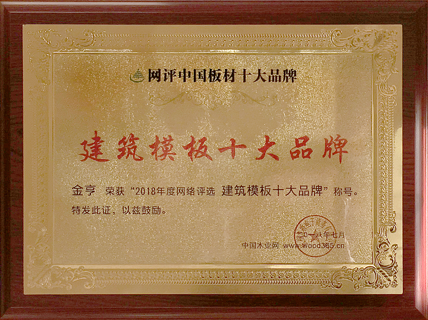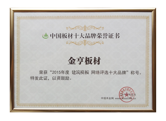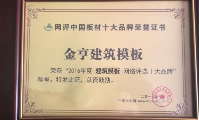 金亨板材榮獲“2018年度建筑模板網絡評選十大品牌”稱號”
