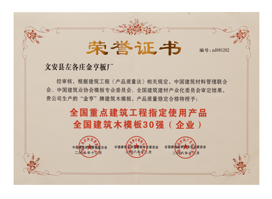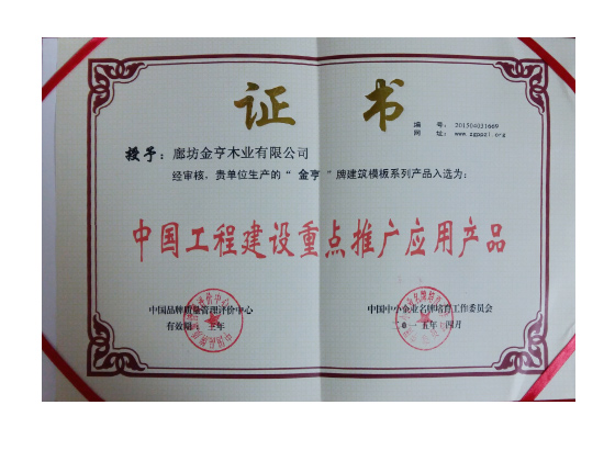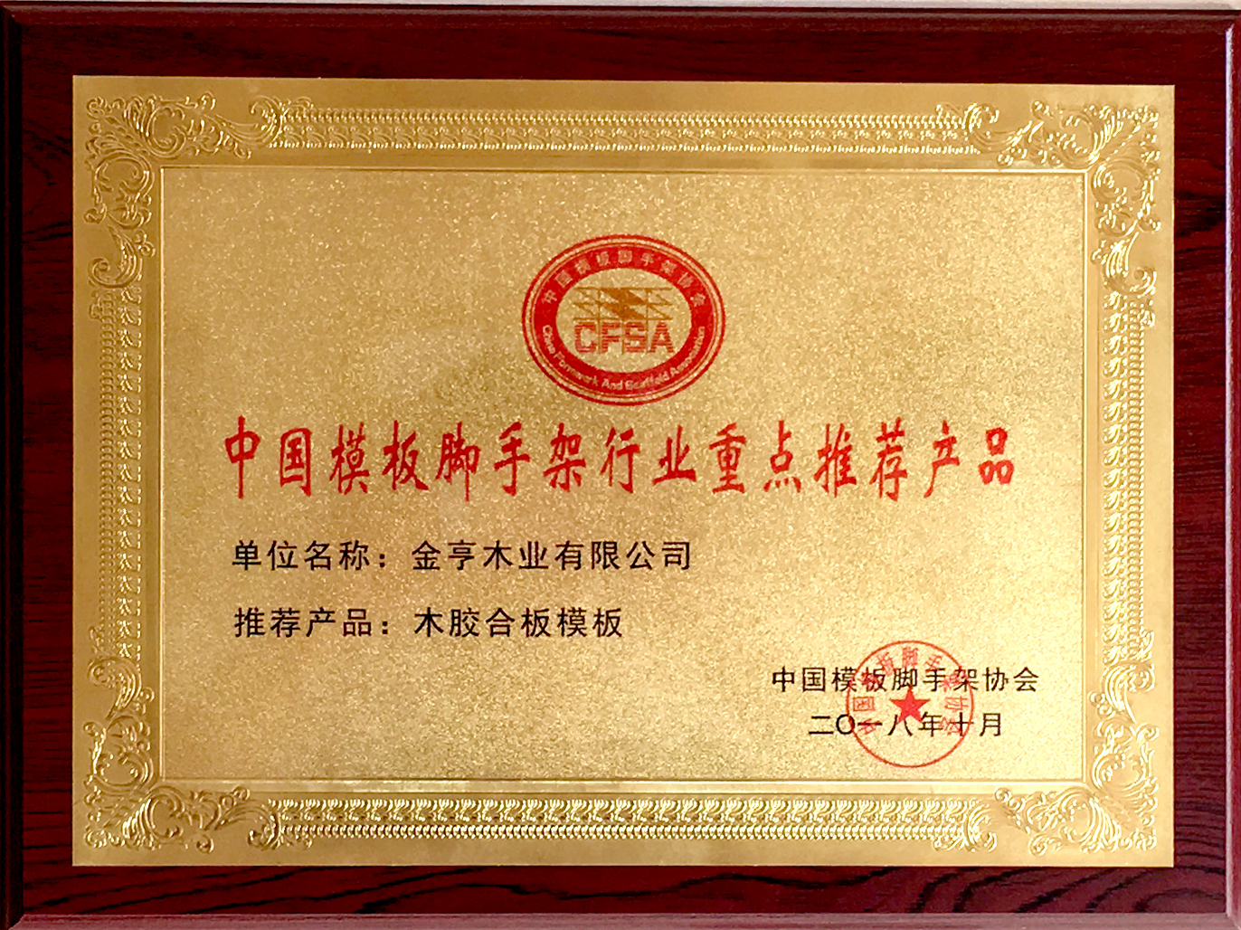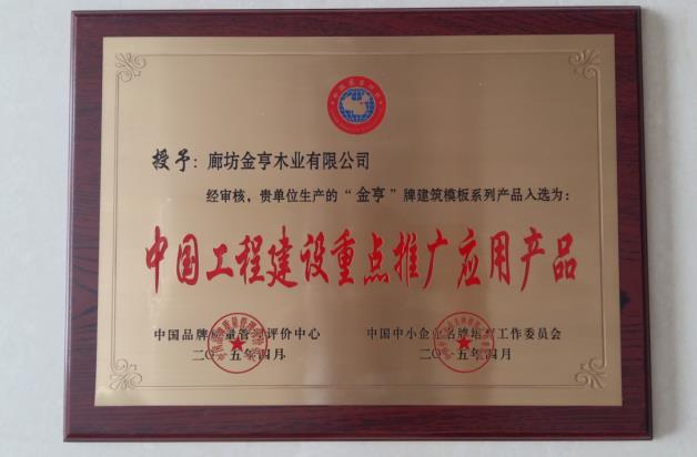 金亨建筑模板被中國模板腳手架協會授予“行業重點推薦產品”