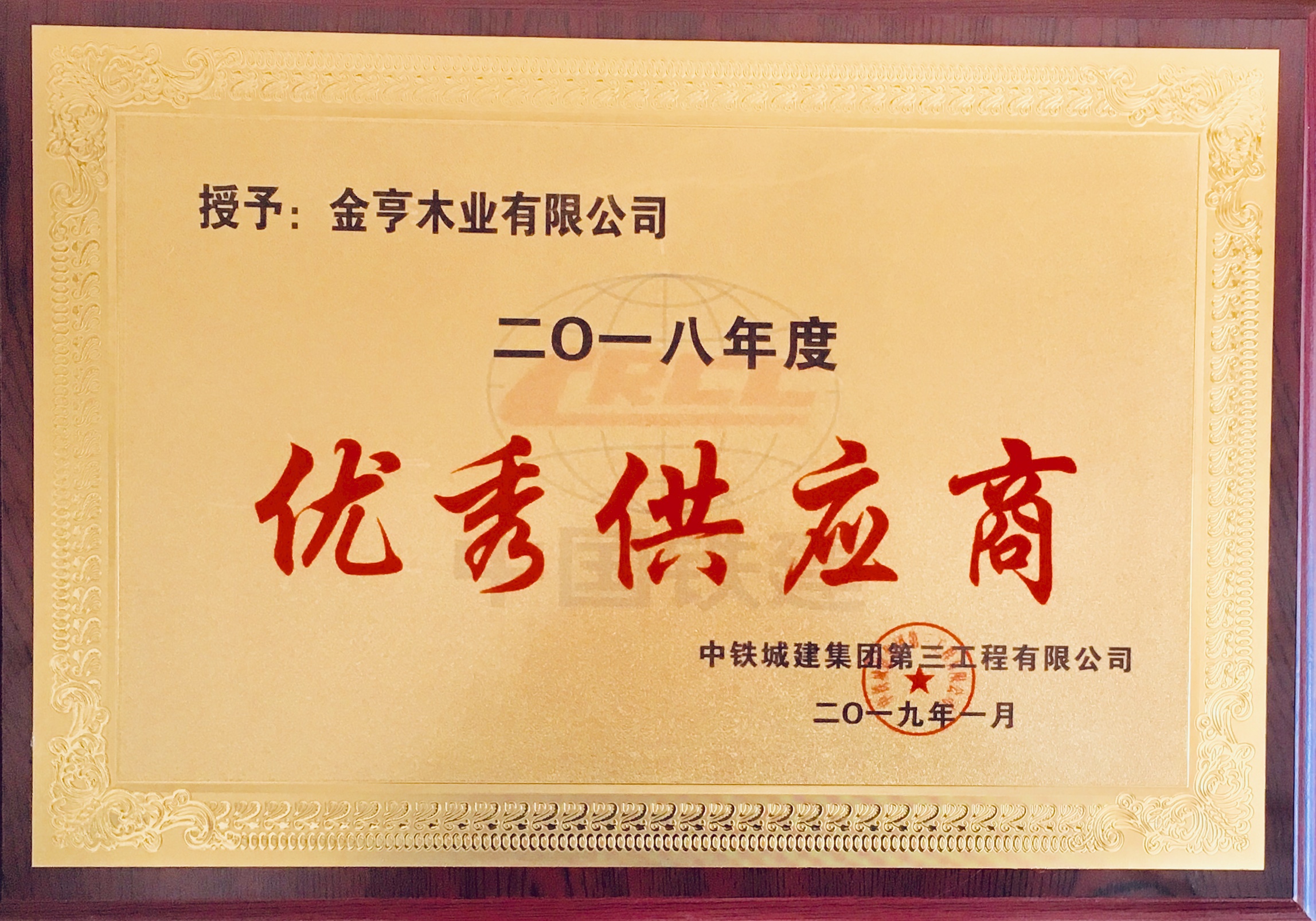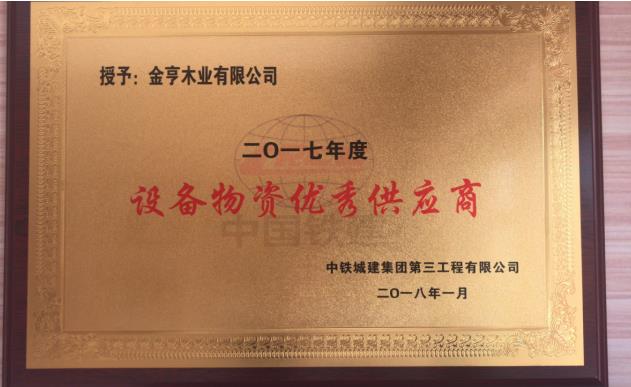 金亨木業有限公司獲評中鐵城建集團2018年“優秀供應商”