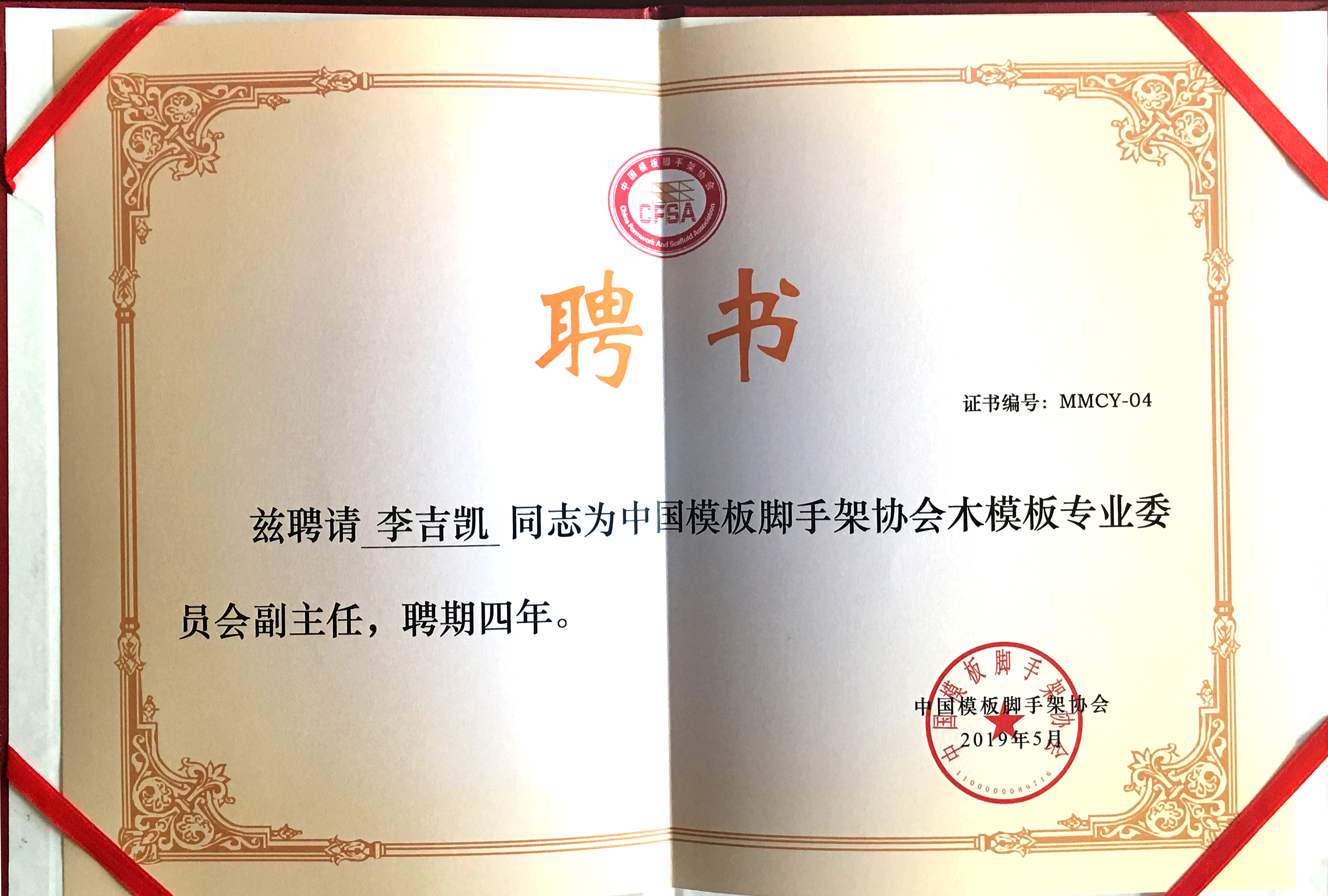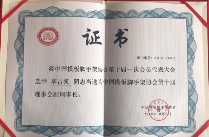 金亨木業有限公司董事長李吉凱獲聘 “中國模板腳手架協會木模板專業委員會副主任”