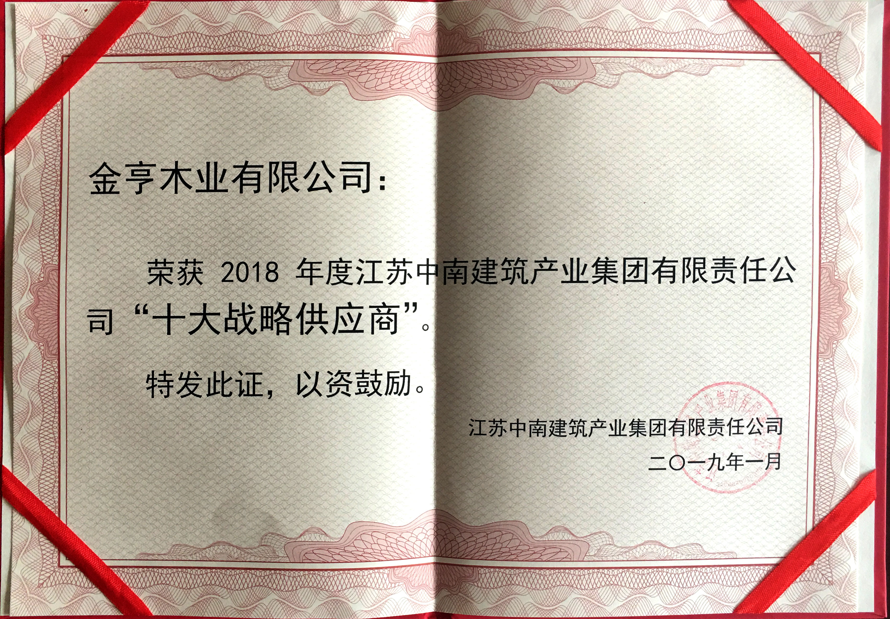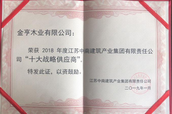 金亨木業有限公司獲評“2018年度江蘇中南建筑產業集團有限責任公司‘十大戰略供應商’”