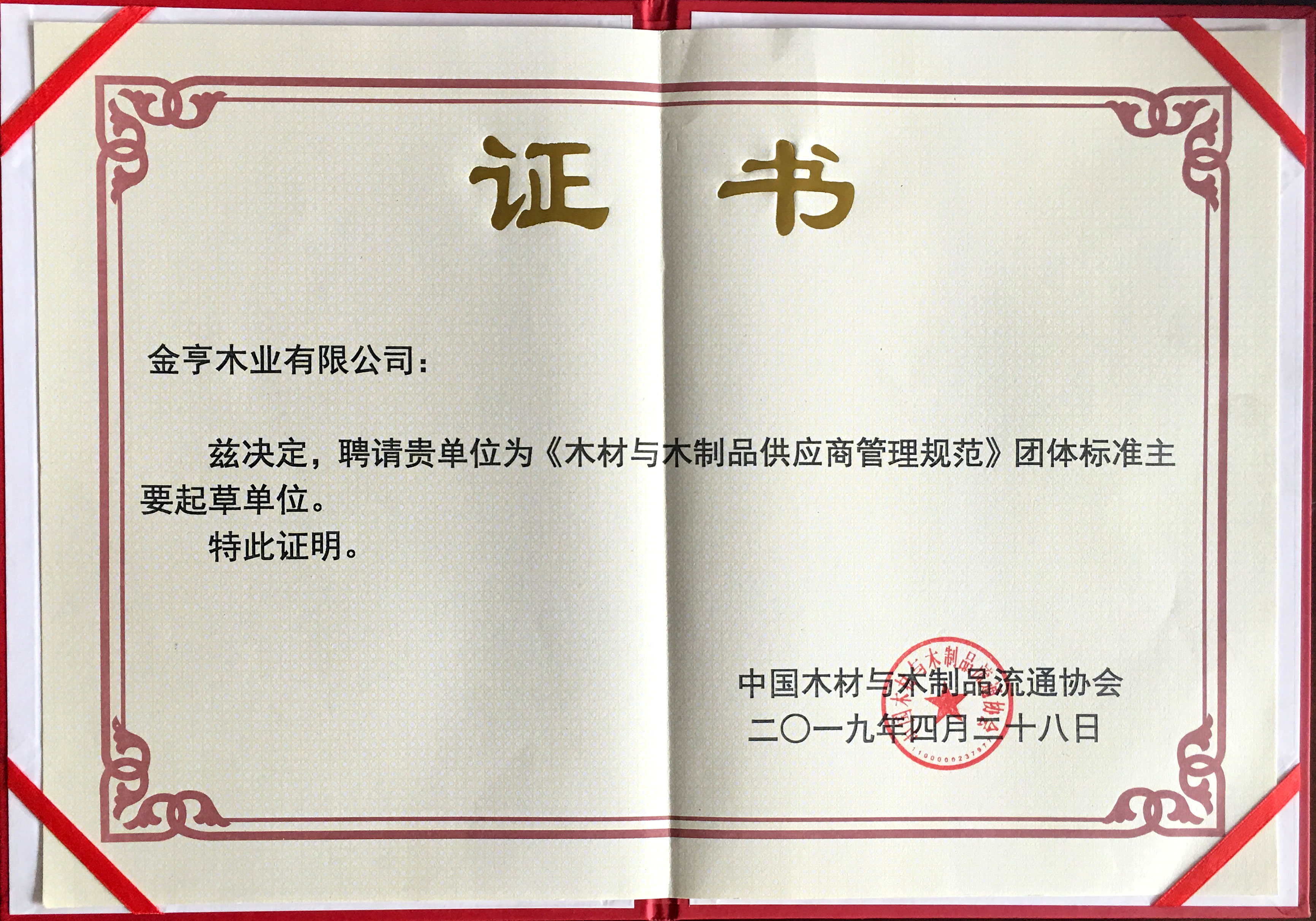 金亨木業有限公司獲評“《木材與木制品供應商管理規范》團體標準主要起草單位”