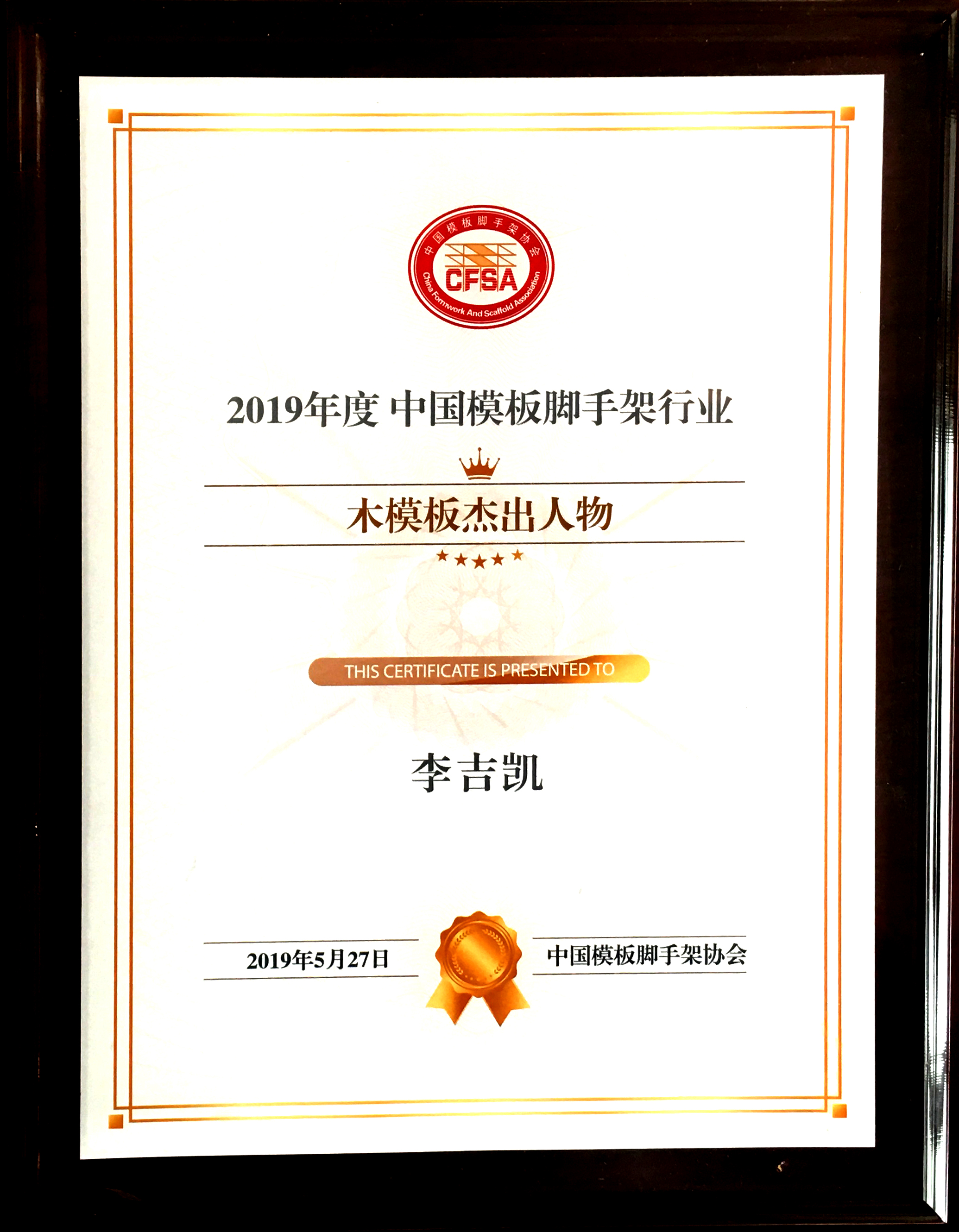 金亨木業有限公司董事長李吉凱獲評 “2019年度中國模板腳手架行業木模板杰出人物”